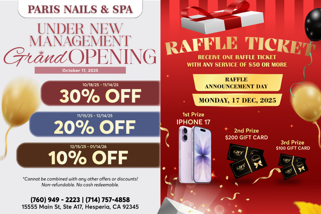 Welcome to Paris Nails & Spa, Hesperia’s premier destination for sophisticated nail artistry and indulgent beauty treatments. Located at 15555 Main St, Ste A17, Hesperia, CA 92345, our chic nail sanctuary has established itself as the ultimate address for refined nail care in the High Desert region. From your first step into our Parisian-inspired space, you’ll understand why stylish clients select Paris Nails & Spa for their pedicures, manicures, Gel X extensions, powder applications, dip services, custom nail designs, kids’ treatments, and professional waxing services.